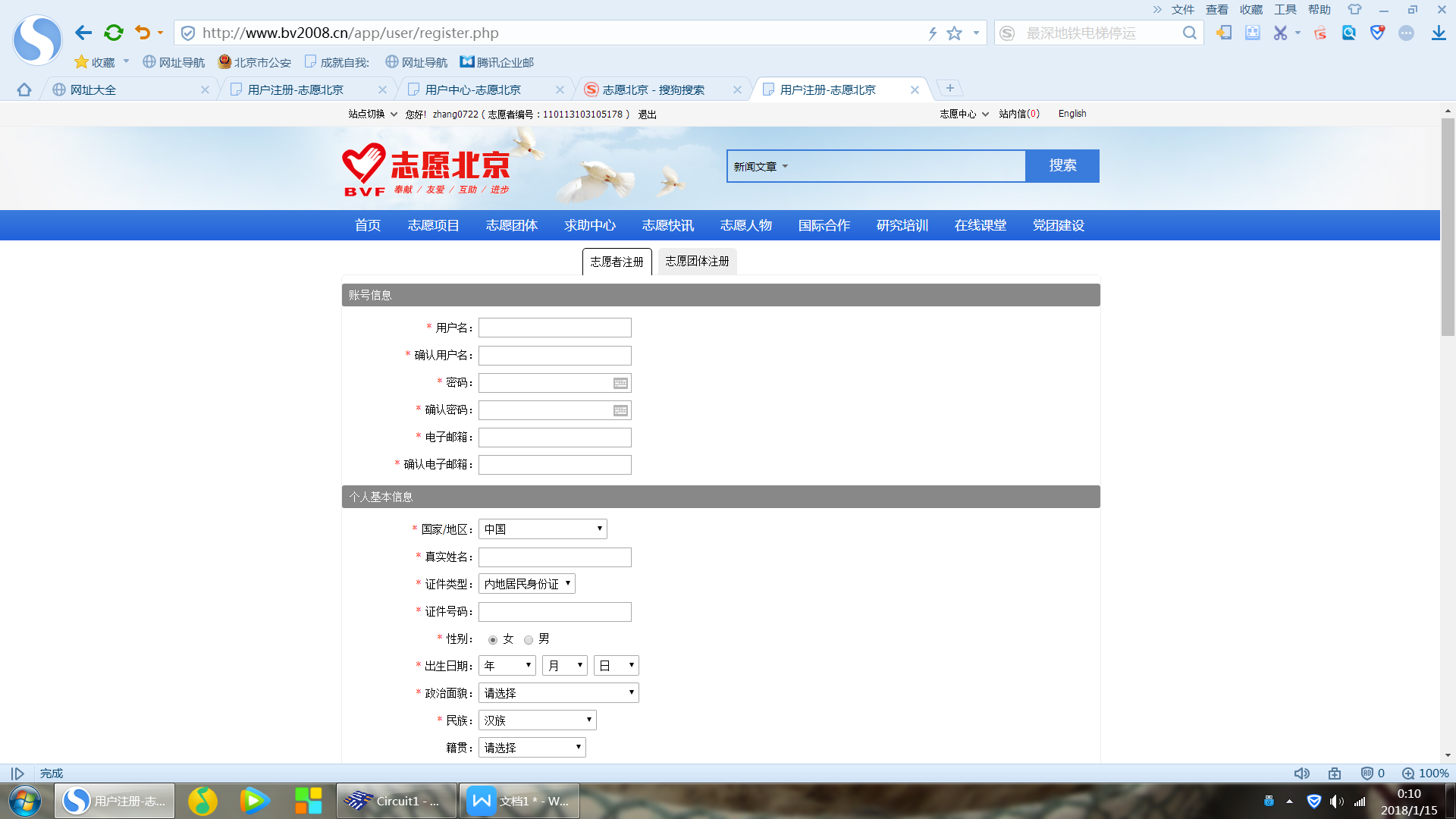 2、在弹出的“志愿者注册”页面中逐项填写个人信息,标*号为必填项。